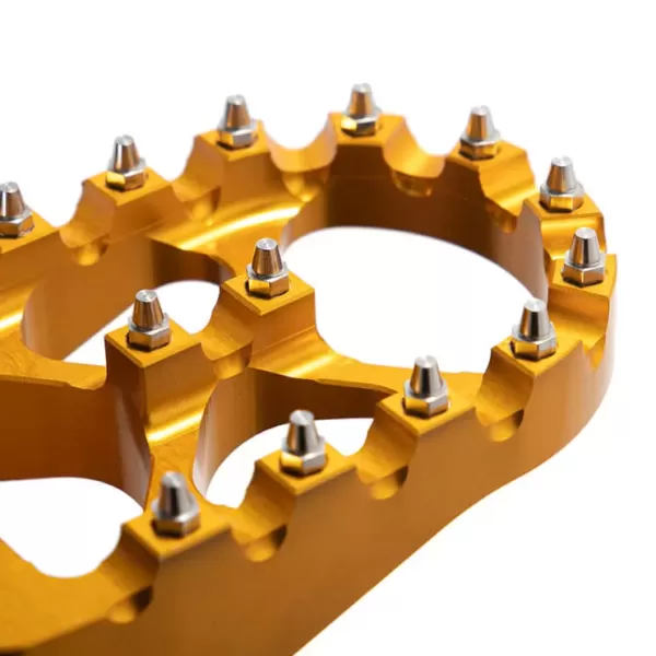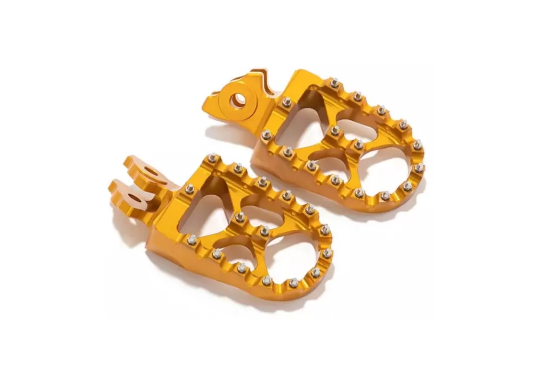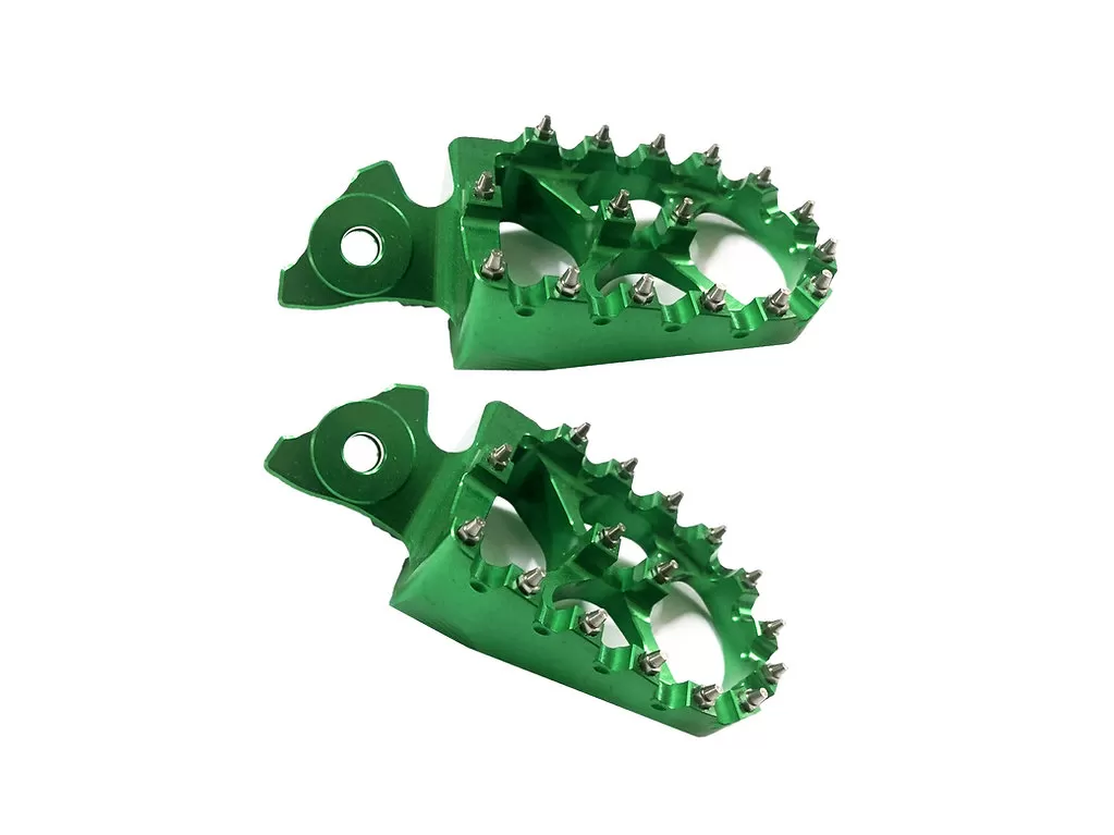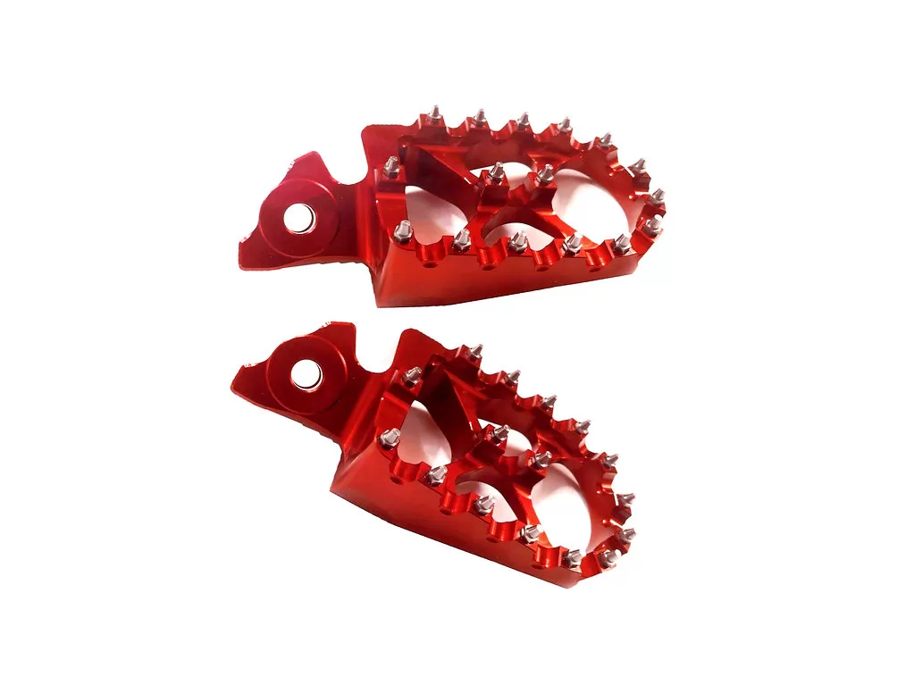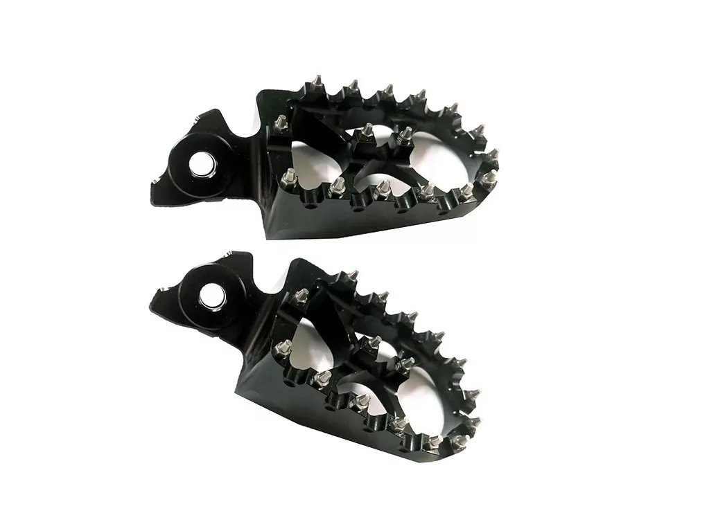 Stupačky na Sur-Ron Light Bee X/L1e Stupačky na Talaria Sting Lehké a široké stupačky s vysokými piny! Materiál: Hliník Dodáváno bez čepu i pružinek, lze použít z originální stupačky. V balení: 1 pár stupaček. 5 ks náhradních vyměnitelných pinů.
